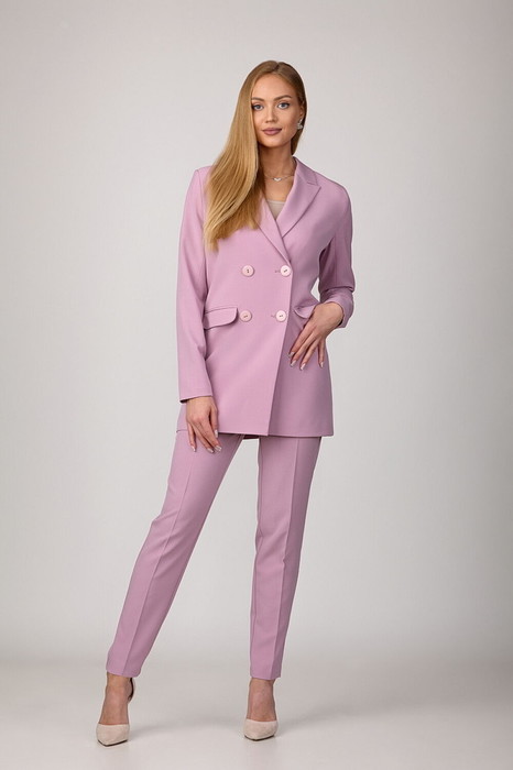 Брючный комплект из костюмной ткани на подкладке. Двубортный жакет выполнен в стиле оверсайз. Воротник-с отложными лацканами пиджачного типа, рукава - двухшовные. Карманы в боковых швах. Жакет застегивается на две основные пуговицы. Брюки слегка заужены к низу, с двумя наклонными карманами и притачным поясом. Застегиваются на молнию по переду и одну пуговицу.