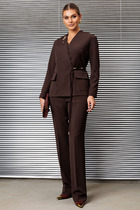 Брючный комплект из костюмной ткани на подкладке. Жакет прямого силуэта с двумя наклонными вытачками и карманами в боковых швах. Рукава - длинные, двухшовные. Жакет застегивается на 1 пуговицу. Цветок ручной работы в виде пиона станет украшением комплекта. Брюки слегка заужены к низу, с двумя наклонными карманами и поясом. Застегиваются на молнию по переду и одну пуговицу.