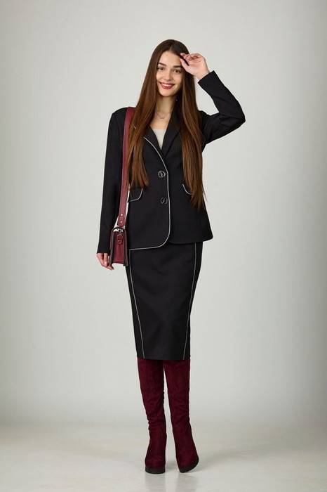 Комплект из костюмной ткани на подкладке, состоящий из жакета и юбки. Жакет приталенного силуэта с прорезными карманами с клапанами по переду. Воротник-английский, рукава - двухшовные. Застегивается на две пуговицы. Юбка на подкладке, слегка зауженная к низу, с рельефами и поясом. Ширина пояса регулируется резинкой. В среднем шве заднего полотнища юбки - застежка-молния и шлица. Кант цвета серебра по краю борта, клапанам жакета и рельефам юбки.