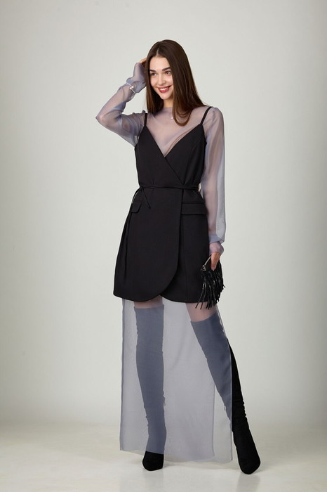 Комплект женский, состоящий из верхнего платья из плательно-костюмной ткани на подкладке и нижнего платья из прозрачной вуали.