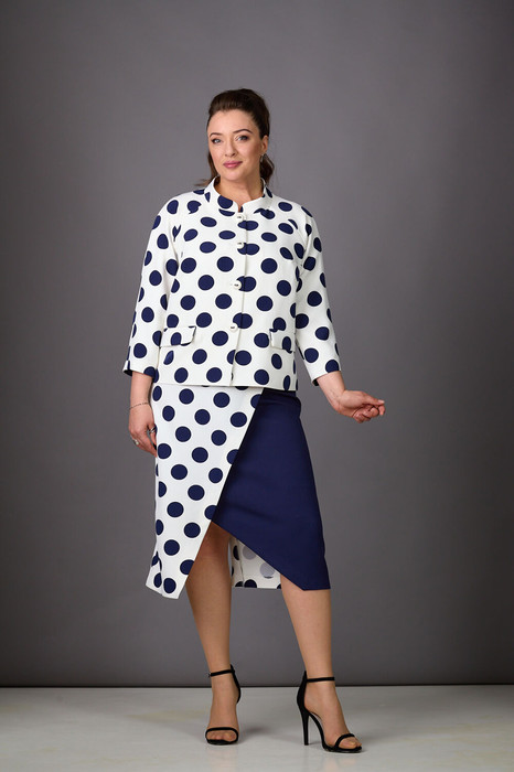 Романтика и эффектная женственность - горохи снова в тренде! В этом комплекте вы точно не останетесь незамеченной! Жакет прямого силуэта с воротником-стойкой и карманами с клапанами. Рукава-реглан, трехчетвертные. Застежка на пуговицы. Юбка с запахом, немного зауженная к низу, с поясом с резинкой. В среднем шве - молния и шлица.