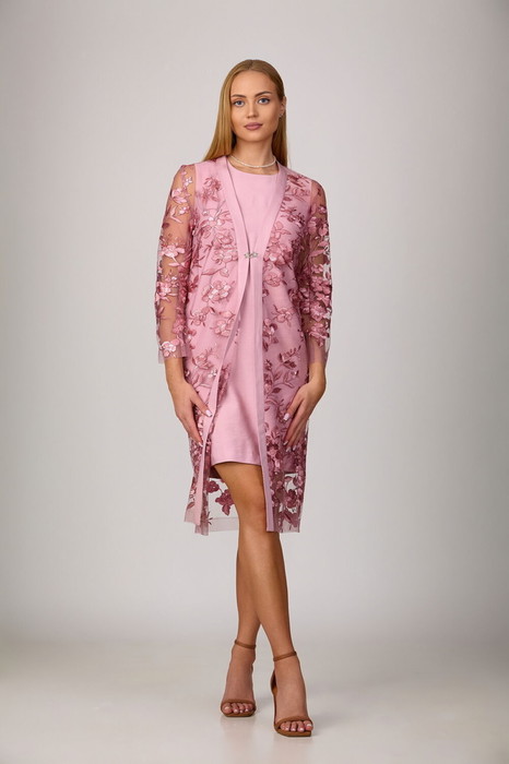 Комплект, состоящий из жакета и платья. Жакет прямого силуэта из нежной сетки с цветами. Жакет застегивается на декоративную застежку-крючок. Платье из плательной ткани прямого силуэта  без рукавов. В среднем шве спинки - застежка-молния. Длина платья 94-98см