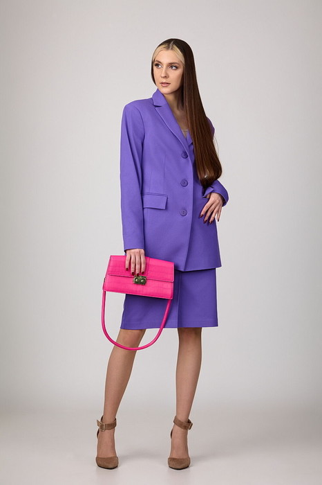 Жакет с расширенной линией плеч, с отрезными бочками по переду и спинке и вытачками по переду. Воротник-с отложными лацканами пиджачного типа. По переду - прорезные карманы с клапанами. Рукава длинные, двухшовные. Жакет застегивается на три пуговицы.