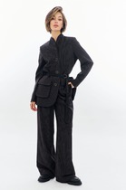 Комплект женский из стрейчевой костюмной ткани на подкладке. Жакет приталенного силуэта с рельефами по переду и спинке, отрезной по линии талии, с роскошной асимметричной баской. Воротник с отложными лацканами пиджачного типа. Рукава - втачные, двухшовные. Жакет застегивается на одну пуговицу. Юбка на подкладке, слегка зауженная к низу, без пояса. Верх юбки обработан обтачкой. Шлица в среднем шве заднего полотнища юбки обеспечит свободу движения. Застежка - молния в среднем шве юбки. Съемная брошь в виде хризантемы ручной работы.