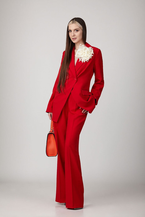 Брючный комплект из костюмной ткани на подкладке. Двубортный жакет полуприталенного силуэта с отрезными бочками и вытачками по переду и спинке. Воротник-с отложными лацканами пиджачного типа. По переду - прорезные  карманы  с клапанами. Рукава длинные, двухшовные. Жакет застегивается на две пуговицы. Жакет декорирован цветами-брошами ручной работы. Брюки прямые со складкой, широким поясом-обтачкой, наклонными карманами. Застегиваются на молнию по переду  и пуговицу.