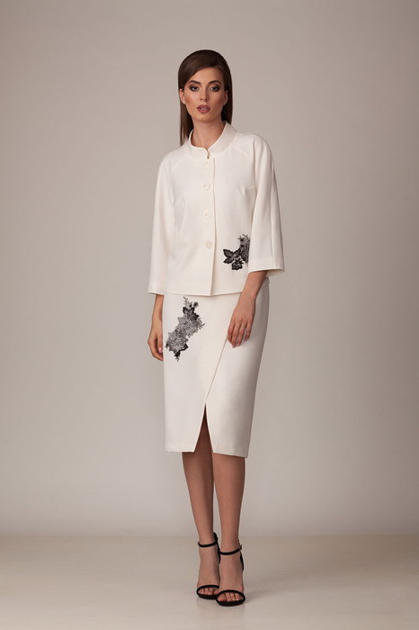 Комплект из костюмно-плательной ткани на подкладке, состоящий из жакета и юбки. Жакет прямого силуэта с двумя нагрудными вытачками. Воротник - стойка. Рукав трехчетвертной. Жакет застегивается на 4 пуговицы.  Юбка на запах, слегка зауженная к низу, с поясом.  Настрочные аппликации   в нижних частях жакета и юбки придают особый шик. Юбка застегивается на 2 пуговицы. Длина жакета 58см, длина рукава 58см (с плечом). Длина юбки 71 см.