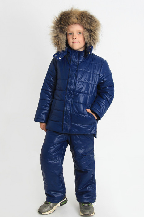 Утепленный комплект для мальчика куртка + комбинезон. Наполнитель - синтепон. Куртка прямого кроя с частой горизонтальной стежкой. Застегивается на молнию, закрытую широкой, утепленной ветрозащитной планкой на кнопках, воротник стойка, съёмный капюшон, который отделан отстегивающимся натуральным мехом енота. Для регулировки посадки капюшона предусмотрена утяжка по овалу лица. На полочках два кармана с листочкой. В боковых швах молнии с пуфтой. Эффективную защиту от ветра обеспечивает юбочка на подкладке куртки, по линии бедер застегивается на липучки. У полукомбинезона имеются регулируемые эластичные подтяжки с пластмассовыми замками, на талии широкая резинка. Ширину низа брюк можно регулировать за счет молнии и пуфты в боковом шве. На комплекте несколько светоотражающих элементов.