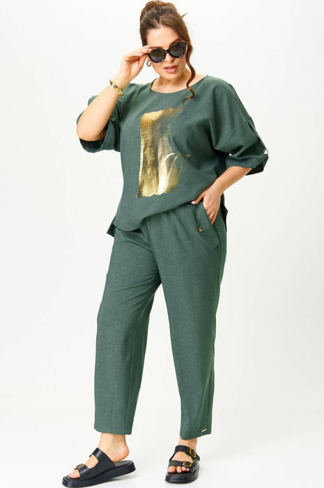 На блузоне выполнена печать фольгой. Брюки  с функциональными карманами, пояс на резинке.