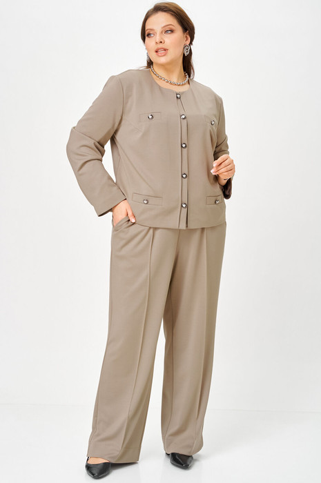 Прямые брюки с отстроченными стрелками визуально вытягивают силуэт, создавая вертикаль. Посадка высокая комфортная, линии — чистые и вытянутые, поэтому костюм одинаково хорошо смотрится на девушках, женщинах высокого, среднего и невысокого роста. Пропорции продуманы таким образом, чтобы модель уверенно садилась на любой тип фигуры.