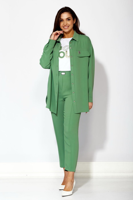 Комплект женский 3х предметный, состоящий из рубашки, брюк и футболки. Рубашка прямого силуэта с длинным рукавом. Рукав со спущенной линией плеча. По низу рукава манжета с застежкой на петлю и пуговицу. По переду рубашки кокетка с отлетными клапанами. Один клапан акцентирован пришивным декором. Застежка центральная с отрезной планкой на петли и пуговицы. Воротник рубашечный на стойке. Низ рубашки фигурной формы. По спинке отрезная кокетка. Брюки зауженные к низу. По бокам наклонные карманы. По переду застрочены защипы в виде "стрелок". Пояс широкий, притачной, частично с резинкой. Спереди, на поясе, декоративная нашивка. Футболка прямого силуэта с коротким втачным рукавом. Вырез горловины круглой формы с подрезной бейкой. Перед задекорирован вышивкой-аппликацией.