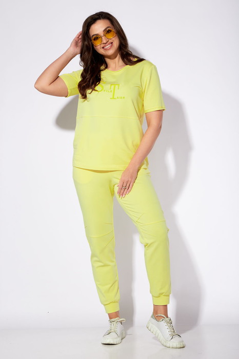 Комплект женский, 2х предметный, состоящий из футболки и брюк. Футболка прямого силуэта с коротким, втачным рукавом. Вырез горловины круглой формы. Горловина и низ рукава обработаны бейкой с открытым срезом. По переду горизонтальный подрез. Верхняя часть задекорирована вышивкой. На спинке акцент в виде нашивки с элементом декоративной тесьмы. Брюки прямые, по низу на притачной манжете. По переду наклонные карманы. В области колена подрез и частичные защипы. Пояс на резинке, по кругу, с отделочной тесьмой спереди.