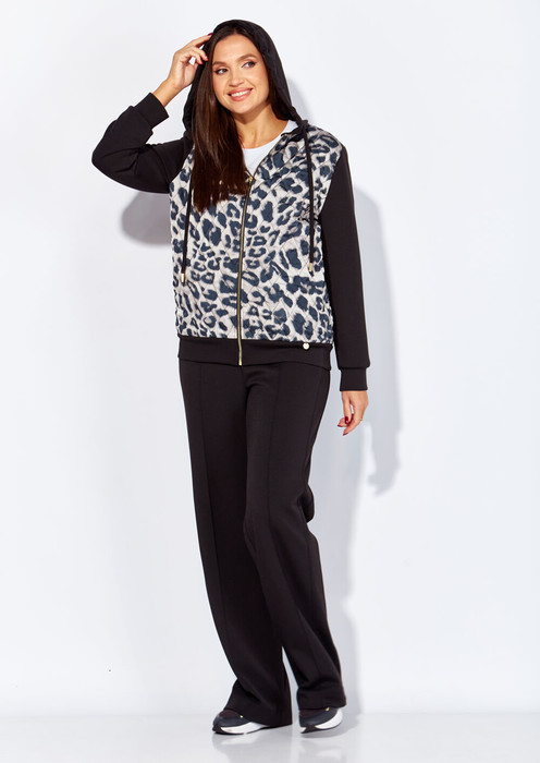 Комплект женский, 2х предметный, состоящий из куртки и брюк, из стежки и трикотажного полотна. Куртка прямого силуэта, по низу на манжете. Перед и спинка выполнены из стеганной на синтепоне, с подкладкой, принтованной текстильной ткани. Карманы в боковых швах. Рукав втачной, длинный, по низу на манжете. Горловина оформлена капюшоном с кулисой. Застежка центральная на тесьму "молния". Брюки широкие, прямые. По боку подрезной лампас с отделочной строчкой и карманы. По центру переда прострочены защипы ("стрелка") Капюшон, рукава, манжет низа куртки и брюки из трикотажного полотна.