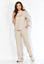 Комплект женский, 2х предметный, состоящий из джемпера и брюк, в сочетании двух видов трикотажного полотна. Джемпер прямого силуэта, с рукавом длинной 3/4. Рукав со спущенной линией плеча. По низу отрезная манжета. Горловина круглой формы, с широкой подрезной бейкой. По низу переда отрезная планка. Перед задекорирован принтом. Манжеты рукавов, бейка горловины и планка низа из отделочного трикотажного полотна. Спинка без особенностей. Брюки прямые. По переду наклонные карманы. Пояс притачной с резинкой и кулисой.