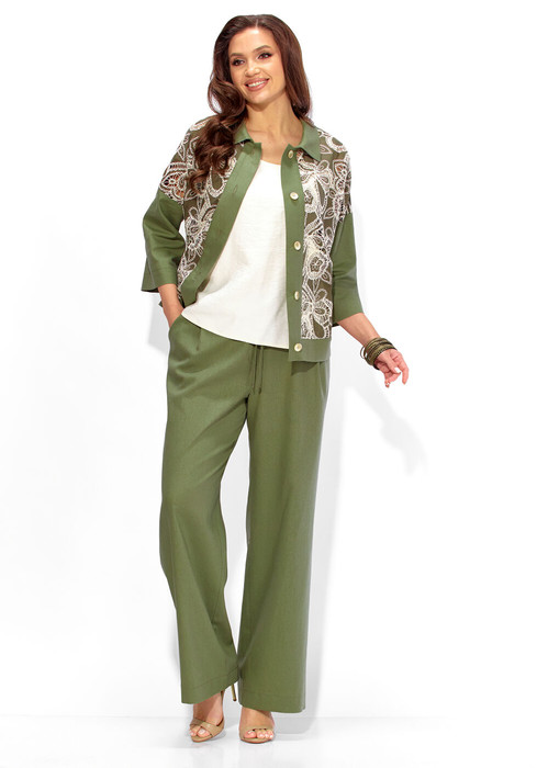 Состав: Жакет- Хлопок-100%; Топ- Вискоза-75%; ПЭ-25%; Брюки- Вискоза-30%; Лён-70%;