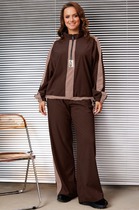 Костюм женский из кулирки, манжеты из кашкорсе (95% хлопок, 5% лайкра). Футболка с карманом-кенгуру и капюшоном на шнурке, с притачной блестящей аппликацией из пайеток. Бриджи с карманами, на поясе с резинкой.