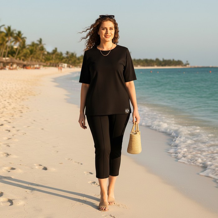 Костюм женский из гладкокрашеного трикотажного полотна футер-двунитка, состоящий из футболки и брюк. Футболка – классического покроя, с короткими втачными рукавами и горловиной овальной формы, обработанной втачной планкой. В нижней части полочки слева настрочен декоративный элемент прямоугольной формы.Брюки – длиной 7/8, слегка зауженные книзу, на притачном поясе с эластичной тесьмой внутри и карманами в боковых швах. Передние половины брюк застрочены по линиям центра вдоль на 0,3 см.