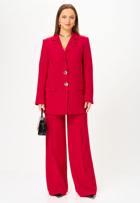 Костюм женский 2-х предметный, состоящий из жакета и брюк. Жакет полуприлегающего силуэта, на подкладке, с одноботной застежкой на петли и пуговицы. Горловина жакета оформлена воротником пиджачного типа. В области бедер обработаны прорезные карманы "в рамку" с клапаном. Спинка жакета со средним швом, заканчивающийся шлицей, левая часть спинки с прорезным карманом в рамку, вход в который фиксирует навесная петля с пуговицей. Брюки формы "палаццо" со стрелками. Верхний срез обработан притачным поясом с резинкой в области спинки. По центру переда - застёжка на крючок и тесьму-молнию. В боковых швах расположены наклонные карманы.