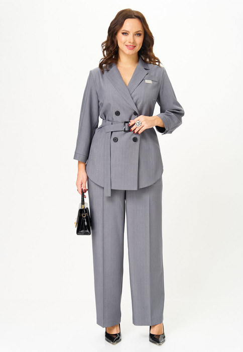 Костюм состоит из жакета и брюк. Жакет без подкладки прямого силуэта, с двубортной застежкой на петли-пуговицы, длиной до середины бедра. Перед жакета с нагрудными вытачками, в области груди расположена декоративная листочка и нашивка. Спинка с двойной кокеткой, в шве притачивания которой обработана встречная складка. Низ жакета фигурный, с закруглениями по боковым швам. Рукава двушовные, длиной 3/4, по низу с манжетой, застегивающейся на петлю и пуговицу. Горловина оформлена воротником пиджачного типа. Брюки классической формы, прямые от линии бедер, со стрелками по передним и задним половинкам. Верхний срез обработан поясом, в который от бокового шва вставлена резинка по задним половинкам. В боковых швах обработаны наклонные карманы. На задних половинках расположены талиевые вытачки. В комплект входит пояс из основной ткани с декоративной пряжкой.