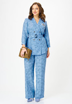 Костюм состоит из жакета и брюк. Качественная поливискоза, из которой выполнена модель, обеспечит долговечность изделию и приятные ощущения его обладательнице. Жакет без подкладки прямого силуэта, с двубортной застежкой на петли-пуговицы, длиной до середины бедра. Перед жакета с нагрудными вытачками, в области груди расположена декоративная листочка. Спинка с двойной кокеткой, в шве притачивания которой обработана встречная складка. Низ жакета фигурный, с закруглениями по боковым швам. Рукава двушовные, длиной  3/4, по низу с манжетой, застегивающейся на петлю и пуговицу. Горловина оформлена воротником пиджачного типа.  Брюки классической формы, прямые от линии бедер, со стрелками по передним и задним половинкам. Верхний срез обработан поясом, в который от бокового шва вставлена резинка по задним половинкам. В боковых швах обработаны наклонные карманы. На задних половинках расположены талиевые вытачки. В комплект входит пояс из основной ткани.