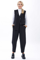 Этот изящный костюм с красивой вышивкой, способен кардинально преобразить любую женщину, создав чувственный и очень женственный образ. Костюм женский с художественной вышивкой на жакете, состоит из жакета полуприлегающего силуэта без застежки, брюк зауженных к низу и блузы свободного кроя. Жакет женский из костюмно-плательной ткани без застежки с художественной вышивкой на передних половинках (на правой половинке в верхней части, на левой вышивка расположена под карманом), на подкладке. Перед с талиевой вытачкой, идущей от подреза, расположенного ниже уровня линии талии, и отрезным бочком. В подрезе обработан карман “в рамку”. Спинка со средним швом и отрезным бочком. Отрезной бочок переда и спинки цельнокроеный. Рукава втачные двухшовные длинные. По низу локтевого шва обработана шлица, застегивается на 4 петли и пуговицы. Горловина с цельнокроеным лацканом, идущим от вытачки горловины и втачным воротником стойкой по спинке и горловине переда. Брюки женские из костюмно-плательной ткани, зауженные к низу с заутюженными стрелками. На правой передней половинке брюк обработан прорезной карман-обманка с 2-я обтачками. На задних половинках брюк стачаны талиевые вытачки и с левой стороны обработан прорезной карман-обманка с листочкой. Верхний край брюк обработан притачным поясом-кокеткой, с пятью шлевками, застегивающийся на 2 петли и пуговицы. Спереди обработана застежка на тесьму-молнию с гульфиком и откоском. Блуза женская двухслойная с цельнокроеным коротким спущенным рукавом. Горловина формы “лодочка”, обтачная. На спинке блузона от горловины обработан обтачной разрез, застегивающийся на навесную петлю и потайную пуговицу. По низу блузон обработан широкой подгибкой. Длина жакета по среднему шву спинки – 65,5 см (±2,0 см), длина рукава жакета – 61,5 см (±1,0 см).