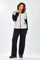 Жакет полуприлегающего силуэта, на подкладке, с центральной бортовой застежкой до верха на 4 петли и 4 пуговицы (размер и цвет фурнитуры может незначительно отличаться от фото). Перед с отрезными бочками, с нагрудными вытачками, идущими от бочков, в верхних и нижних частях с настрочными листочками, имитирующими прорезные карманы. На листочки пришиты декоративные пуговицы. Спинка со средним швом, с рельефными швами, идущими от пройм вниз. Рукава втачные, двухшовные, длинные. Горловина переда и спинки обтачная, округлой формы. Жакет с плечевыми накладками.