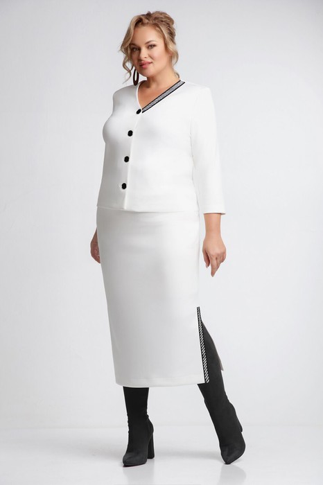 Костюм женский двухпредметный, состоящий из трикотажного жакета и юбки. Жакет без подкладки с центральнрй бортовой застёжкой на 4 петли-пуговицы и с нагрудными вытачками, выходящими из боковых швов. По левой части горловины переда настрочена отделочная тесьма. Спинка со средним швом. Рукава втачные одношовные длиной 3/4. Юбка прямого силуэта, длиной миди (до половины голени) с разрезами сбоку, декорированными отделочной тесьмой, по поясу на резинке. Длина жакета по спинке - 56 см. Длина рукава - 49 см. Длина юбки по боковому шву - 80 см.