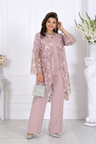 Костюм женский двухпредметный, состоящий из жакета и юбки. Жакет полуприлегающего силуэта с центральной бортовой застежкой на 5 петель-пуговиц. По переду обработаны нагрудные вытачки и по 3 защипа-складки по талии. Спинка со средним швом и двумя защипами-складками с двух сторон. Горловина V-образной формы, с цельнокроенной стойкой и с отрезным швом по спинке. Рукав втачной двухшовный длинный. Юбка заужена к низу, длиной за колено. Переднее полотнище с талиевыми вытачками. Заднее полотнище со средним швом, заканчивающимся шлицей, и с застежкой на потайную тесьму-молнию. Заднее полотнище также с талиевыми вытачками по 2 шт.