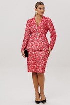Костюм женский двухпредметный, состоящий из жакета и брюк. Жакет полуприлегающего силуэта, удлиненный, с центральной бортовой застежкой на 2 петли-пуговицы до линии перегиба лацкана. Перед с нагрудными вытачками, выходящими из горловины. Боковые швы с разрезами, между которыми по спинке вставлен пояс фигурной формы с декоратичной нашивкой. Спинка со средним швом. Воротник пиджачного типа. Рукава втачные двухшовные длиной 3/4. Брюки палаццо с притачным широким поясом на резинке от заутюженных стрелок по передней половинке вкруговую. Застежка на тесьму-молнию в средних срезах передних половинок брюк и 2 петли-пуговицы по поясу.