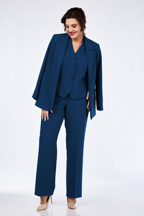 Костюм женский 3-х предметный, полуприлегающего силуэта. Состоит из жакета и жилета на подкладке и брюк. Жакет с воротником пиджачного типа, центральной застёжкой на 1 петлю и 1 пуговицу. Перед с рельефными швами от пройм до низа и талиевыми вытачками и прорезными карманами с листочками с втачными концами. Спинка со средним швом. Рукав втачной, двухшовный, длинный со шлицей. Жилет с рельефными швами от пройм до низа по переду и спинке, с центральной застёжкой на 4 петли и 4 пуговицы. Перед с прорезными карманами с листочками с втачными концами. Брюки с застёжкой на тесьму "молнию" в средних срезах передних половинок, с притачным поясом на 1 петлю и 1 пуговицу и резинкой по задним половинкам, с карманами наклонными к боковым швам. По передним и задним половинкам заутюженные канты. Длина жакета по спинке - 71 см. Длина рукава - 61 см. Длина жилета по спинке - 54 см. Длина брюк по боковому шву - 101 см.