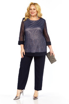 Костюм женский двухпредметный, состоящий из жакета на подкладке и брюк. Жакет со слегка спущенной линией проймы, свободного силуэта, с центральной бортовой застежкой на 5 петель-пуговиц от линии перегиба лацкана. Жакет с талиевыми вытачками от низа и до линии груди и планкой от талиевых вытачек вкруговую, переходящую на спинку. Жакет скомбинирован из двух цветов ткани: воротник, планка и отделочная деталь шлицы рукава выполнены из ткани в цвет брюк. Спинка со средним швом. Воротник пиджачного типа. Рукава втачные, двухшовные, с фантазийным элементомпо низу локтевого среза, имитирующим шлицу. По левой части переда обработан хлястик сс одной петлей-пуговицей, имитирующей карман. Брюки заужены к низу, с притачным поясом на 2 петли-пуговицы, с застежкой на тесьму-молнию в средних срезах передних половинок. Пояс сзади на резинке. По передним срезам канты отстрочены защипом на 0,2 см. В брюках обработаны карманы, наклонные к боковым швам.