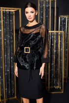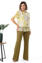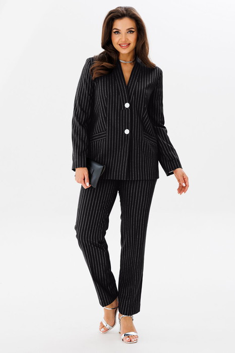 Костюм женский двухпредметный, состоящий из жакета и брюк. Жакет полуприлегающего силуэта с центральной бортовой застёжкой на две петли-пуговицы и подрезом фигурным от бокового шва, переходящим в нагрудную вытачку. В подрезе обработан карман с листочкой. Спинка со средним швом. Воротник фантазийной формы - в виде подреза, переходящего в стойку. Рукава втачные, двухшовные. Брюки с притачным поясом, по задним половинкам вставлена резинка. Застёжка на тесьму-молнию в среднем срезе и одну петлю-пуговицу по поясу. Брюки слегка зауженные к низу с наклонным карманом из бокового шва и заутюженными стрелками. Длина жакета по спинке - 67,5 см. Длина рукава - 61 см. Длина брюк по боковой части - 99 см.