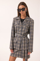 Жакет полуприлегающего силуэта с естественной линией плеча. Перед с центральной бортовой застежкой на петли-пуговицы. По переду и спинке для придания прилегания застрочены складки. Воротник - цельнокроеная стойка. Рукав втачной длинный. В локтевом шве рукава обработана отлетная шлица с отделочной пуговицей.
