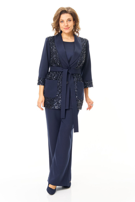 Жакет свободного покроя с естественной линией плеча. Рукав втачной одношовный длиной 3/4 с манжетой из отделочной ткани "пайетки". Перед выполнен из отделочной ткани "пайетки" на атласной подкладке. Обработаны отрезные планки. Застежка центрально-бортовая на петли пуговицы. Воротник отложной типа "шаль". На переде выполнены накладные карманы.