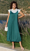 Блуза прилегающего силуэта с округлой формой горловины оформленной бейкой. По спинке блузы отрезные кокетки. Рукав короткий, в форме крылышка.Верхнее платье свободного силуэта, идеально подойдет для женщин с разными типами фигур, и благодаря силуэту хорошо сядет на большие размеры. Плавный V-образный вырез мягко переходит в цельнокроеные бретели переходящие на спинку, образуя легкую сборку, которую можно регулировать. По спинке V-образный углублённый вырез со сборкой, а так же декоративный элемент в виде перекрученной планки.  Низ  платья со сборкой на тесьму-резинку, образуя «балон» по низу.