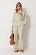 Костюм женский, состоящий из блузки и брюк-кюлот. Блузка свободного силуэта. Горловина округлой формы с отложным воротником на стойке фигурной формы переходящим на спинку из отделочной ткани. По спинке вырез капелька с застёжкой на пуговицу, спинка со средним швом. Рукав цельнокроены с со сборкой на притачной манжет по низу. Боковой шов слегка переходит на перёд. Низ в блузке ассиметричный с разрезами в боковых швах. Брюки-кюлоты свободного силуэта, длиной 7/8 расширяются к низу. Пояс притачной со вставкой эластичной тесьмы-резинки, которая обеспечивает максимально удобную посадку на любой тип фигуры. По переду брюк от верха застрачиваются складки. В задней части брюк застёжка на тесьму-молнию в шве и пуговицу в поясе. В боковых швах брюк- карманы.