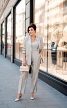 Ткань с мерцающим отливом, не кричащим, а лишь намёком напоминающим о вечернем свете. Это костюм для женщины, которая ценит безупречность линий, но не боится лёгкого сияния. Он струится по фигуре, как жидкий шёлк, переливаясь при каждом движении — элегантный, сдержанный, но не лишённый изысканной роскоши.Жакет свободного силуэта с центральной застёжкой на петлю-пуговицу по краю борта, отложными лацканами и воротником пиджачного типа и отрезными бочками. По переду жакета талиевые вытачки и прорезные карманы с клапаном. Спинка в жакете со средним швом заканчивающимся отлетной шлицей. Рукав втачной, длинный, двухшовный с декоративной шлицей фиксирующейся на декоративную пуговицу. Жакет на подкладке. Брюки прямого силуэта с застроченными стрелками по переду, с застежкой на тесьму молнию в гульфике и пуговицу в поясе. По переду брюк наклонные карманы. Пояс притачной с декоративными шлёвками и вставкой эластичной тесьмы резинки в «бочках», что обеспечивает комфортную посадку на фигуру. Обращаем Ваше Внимание, что фурнитура может незначительно отличаться от фото.Длина жакета по спинке 72 см. Длина рукава жакета 62 см. Длина брюк по боковому шву 98 см.