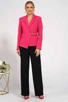 Это стильный и современный ансамбль, который состоит из блузы и брюк. Изысканный женский комплект идеален для торжественных мероприятий, он станет жемчужиной вашего гардероба. Брючный комплект можно дополнить минималистичными украшениями, которые подчеркнут утончённость, завершая этот элегантный, но уверенный образ.Блуза (состав: 61% район, 39% вискоза) свободного силуэта с асимметричной формой горловины: одно плечо открыто, расположен декоративный элемент чёрного цвета из отделочной ткани. Рукав цельнокроеный. Спинка без особенностей. Блуза на подкладке. Брюки (состав: 100% полиэстер) свободного кроя выполнены из плотной, матовой ткани чёрного цвета. Их широкий фасон и высокая посадка на талии создают элегантный и удлинённый силуэт, а также контрастируют с лёгким и воздушным верхом. Пояс в брюках притачной со вставкой эластичной тесьмы-резинки в бочках. По переду брюк от пояса застрачивается складка. В среднем шве брюк застёжка на потайную тесьму молнию и пуговицу в поясе. Длина блузы 56,5 см (р 52-56), 57,5 см (р 58-62), длина рукава 36,5 см (р 52-56), 37,5 см (р 58-62). Длина брюк 108 см.