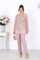 Комплект женский, состоящий из блузки и брюк. Блуза (состав: 61%район, 39%вискоза) выполнена из ткани с тонким шёлковым блеском - мерцает при движении. Блуза свободного силуэта с вырезом горловины в виде «лодочки». Спинка без особенностей. Низ ассиметричный с разрезами в боковых швах от низа. Рукав в блузе втачной на подкладке, в виде буфа, с залаженными декоративными складками по окату и низу. В комплекте идёт пояс из основной ткани. Брюки (состав: 60% полиэстер, 40% полиуретан) прямого силуэта из кожи с рельефами и отстрочкой по переду. По переду застежка на тесьму молнию в гульфике и пуговицу в поясе. По переду брюк наклонные карманы. Пояс притачной со вставкой эластичной тесьмы резинки в «бочках», что обеспечивает комфортную посадку на фигуру. Длина блузы 76,5 см (р 50-54), 77 см (р 56-60), длина рукава 37/45 см. Длина брюк по боковому шву от пояса 98 см.