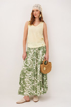 Костюм двухпредметный состоящий из блузы и юбки. Подойдет для повседневной носки и торжественных случаев в летний период. Костюм в романтическом стиле среднего объема полуприлегающего силуэта по геометрическому подобию напоминает трапецию. Пластическая форма мягкая, плавная.Блуза прямого силуэта, прилегание по груди достигнуто горизонтальными вытачками. Блуза без рукавов, линия низа фигурная, плавная.Юбка коническая, немного расклешённая к низу. На поясе по бокам для прилегания и комфорта движения вставлены резинки, застежка юбки на потайную молнию в среднем шве и пуговицу на поясе. Декоративными элементами по переду и спинке являются рельефы, в которые вставлена декоративная бахрома из основной ткани. Юбка на подкладке в длине миди.Стильный костюм с идеальной посадкой по фигуре подойдет вам как базовая вещь в гардеробе. Модель в тренде сезона комфортна на каждый день создает женственный элегантный образ. Комплект создан из качественных материалов, делает акцент на фигуру и идеален для капсульного гардероба. Длина блузы 63 см.ю длина плеча 8 см (р 52-56), 8,5 см (58-62). Длина юбки 92,5 см.