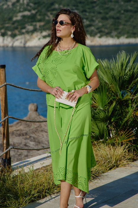 Комплект женский, двух предметный, состоящий из блузы и платья. Этот комплект — не просто одежда, а настоящее летнее настроение, застывшее в ткани. Он говорит о женщине, которая ценит красоту в деталях, смело экспериментирует с формами и цветами, и при этом сохраняет врожденное чувство стиля и гармонии. Комплект мастерски сочетает в себе: воздушность ажурного ришелье; сочность салатового цвета; динамику асимметричных линий, элегантность классического кроя. Блуза свободного силуэта, с округлой формой горловины. Рукав в блузе цельнокроеный с притачной фигурной манжетой по низу. По переду и спинке блузы диагональный подрез с декоративной вставкой из вышивки ришелье. Низ в блузе фигурной формы, создавая динамичный, летящий силуэт. Платье А-силуэта, длины «миди».  Основная часть платья выполнена из однотонной ярко-салатовой ткани. Этот оттенок оживляет кожу, придает лицу свежесть, а глазам — особый блеск. Силуэт платья мягко облегает фигуру, не стесняя движений. Широкие бретели — стильный акцент, который одновременно практичен и элегантен. Они уверенно лежат на плечах, подчеркивая их линию, и переходят в глубокий вырез, открывающий ключицы. Горловина в платье округлой формы, по переду нагрудные вытачки. По низу платья притачной волан со вставкой «на просвет» декоративного кружева. Нижний ассиметричный волан из отделочной ткани — кружева. Асимметричный волан — главное украшение платья. При движении волан колышется, создавая иллюзию, будто платье живет своей собственной, таинственной жизнью. Платье на подкладке. Длина блузы по левой стороне 66 см (р 52-56), 68 см (р 58-62), по правой стороне 56 см (р 52-56), 58 см (р 58-62). Длина платья 126 см (р 52-56), 127 см (р 58-62).
