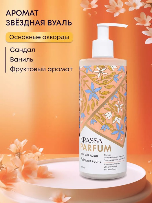 Гель для душа серии KRASSA Parfum аромат "Звездная вуаль" имеет не навязчивый селективный аромат из Франции. Перламутровый гель для душа создан специально для ухода за кожей.