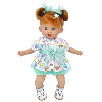 Одета - рейтузики зелёного цвета, белое с рисунком платье, на поясе повязан зелёный бант, белые сандалии на шнуровке.