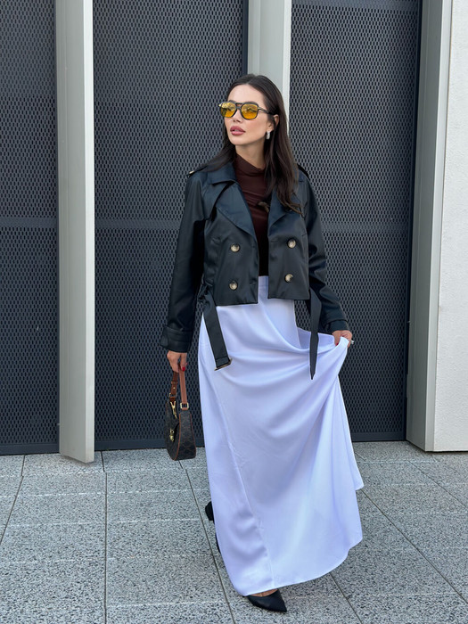 Тренч укороченный, на подкладке. Рукав прямой, длинный, реглан. По переду обработаны втачные карманы. Паты обработаны по плечевым швам и на манжетах. Паты пришиты на пуговицы. По низу тренча обработаны шлёвки и съёмный пояс. Застёжка - 2 ряда пуговиц по центру переда.