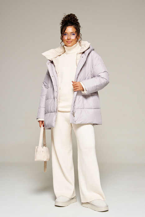 Застежка центральная на двустороннюю молнию от уровня груди до низа и кнопки по краю борта.