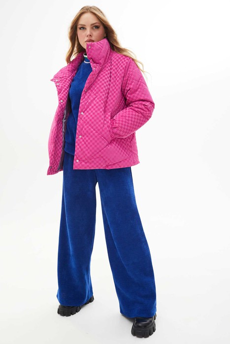 Куртка женская утеплённая осень-зима,  прямого силуэта, со спущенными плечами, выполнено из ткани лаке на утеплителе изософт. По переду прорезные карманы с листочкой и застёжка на 7 кнопок. Воротник стойка. Рукава одно шовные втачные. Низ  рукавов собран на эластичную тесьму резинку. Подкладка простёгана с утеплителем изософт