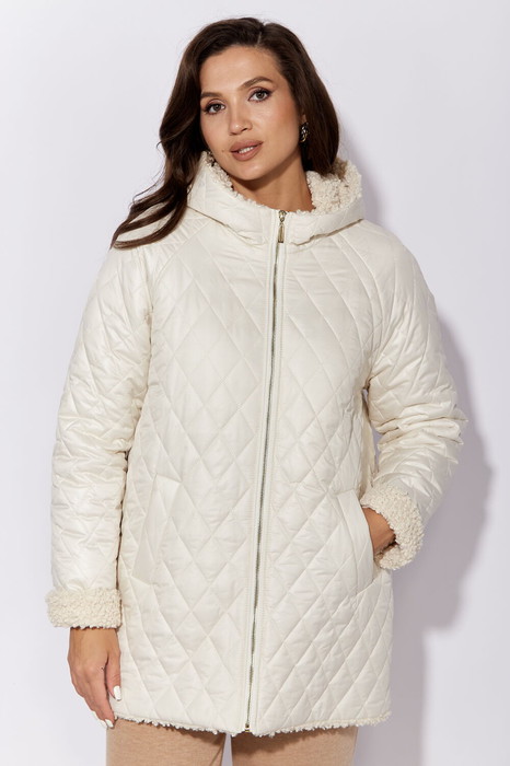 Куртка женская, демисезонная. Верх куртки - плащевка, стеганная на синтепоне. Подкладка - экомех "барашек". Куртка прямого силуэта с длинным рукавом "реглан". Длина рукава может регулироваться отворотом. По переду центральная застежка на "молнию" и прорезные, функциональные карманы. Горловина оформлена капюшоном-стойкой по переду.