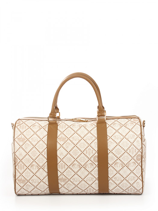 Сумка дорожная выполнена из экокожи «канва». Детали: 2 ручки по 40 см, 1 длинный регулируемый ремень на карабинах. Внутри изделия: 1 отделение на молнии, 1 карман на молнии, 1 карман открытый. Снаружи изделия: 1 карман на молнии с оборотной стороны изделия, 2 кармана на магнитных кнопках по бокам изделия. Брендированная подкладка из хлопка. Металлическая брендированная фурнитура золотистого цвета.