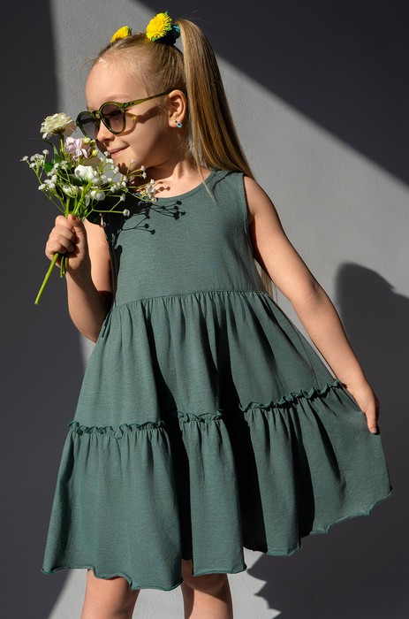 Легкое платье для девочек и девочек-подростков выполнено из натурального 100% хлопка и представлено в темно-зеленом цвете. Свободная модель, застежка на пуговицу по спинке – каждая деталь создана для комфорта ребенка. Благодаря широкому волану и сборкам на юбке летнее платьице для детей поможет создать яркий образ.