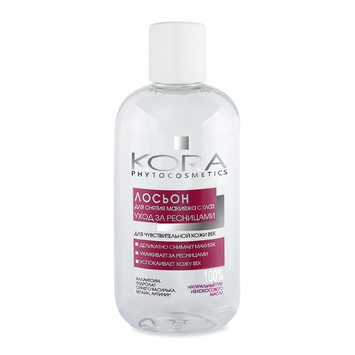 Демакияж — необходимый и важный этап ухода за кожей, так что средства для этого процесса стоит выбирать тщательно. Специалисты «Лаборатории KORA» разработали Лосьон для снятия макияжа с глаз, обладающий высокой эффективностью.Активная формула средства отлично удаляет даже стойкий make-up с глаз, не содержит агрессивных компонентов, не раздражает слизистую. Лосьон для снятия макияжа век представляет собой жидкий раствор с легким ненавязчивым запахом. После использования не остается неприятной жирной пленки, чувства стянутости и дискомфорта.В состав Лосьона для снятия макияжа с глаз входит 100% натуральный ПАВ из кокосового масла и аргинин. Аргинин – натуральная заменимая аминокислота. Поимо очищающего эффекта, он замедляет процессы старения, обеспечивает защиту кожи, борется с мимическими морщинами вокруг глаз и ликвидирует темные круги, активно питает ресницы, способствует их нормальному росту и восстановлению структуры.В состав лосьона входят увлажняющие компоненты: аллантоин и бетаин. Аллантоин – вещество, которое образуется при окисление мочевой кислоты. Обладает увлажняющими и смягчающими свойствами. Бетаин – простейшая из аминокислот, выделенная впервые из сока сахарной свеклы. Смягчает, освежает, успокаивает кожу вокруг глаз.Гидролат василька содержит в своем составе натуральные биофлаваноиды с ярко выраженные антибактериальными свойствами. Еще это прекрасное средство для ухода за областью вокруг глаз. Способствует устранению отечности и темных кругов под глазами, успокаивает кожу век. Обладает тонизирующим, разглаживающим действием. Будет полезна обладателям чувствительной кожи.Активные ингредиенты: Аргинин, бетаин, аллантоин, гидролат василька синего.Применение: Нанесите средство для снятия макияжа на ватный спонж, бережно удалите косметику движениями от внутреннего уголка глаза к внешнему. Не растягивайте и не трите кожу. Подходит для ежедневного применения в домашних условиях.
