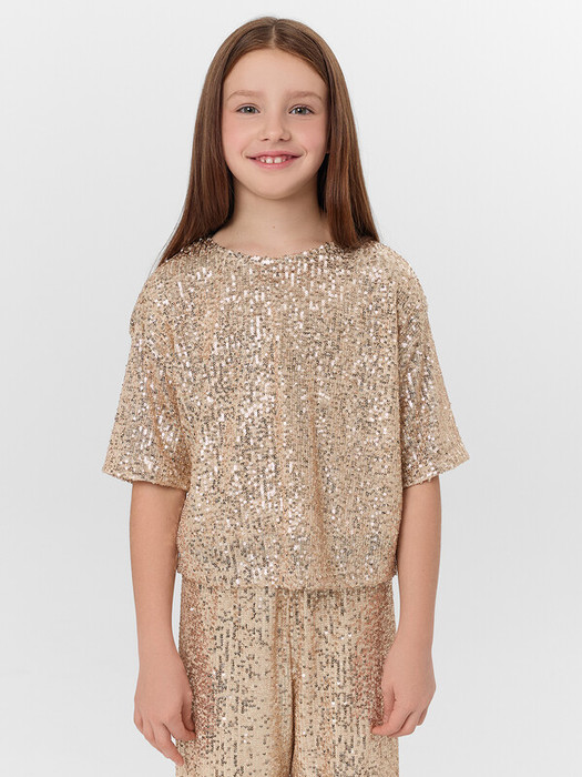 Блузка прямого силуэта, выполнен из пайеток. Вырез горловины круглый. Рукава короткие. Спинка и полочка цельнокройные, спинка длиннее переда. По спинке застежка-капелька на одну петлю WT4-6 и пуговицу d=10mm.